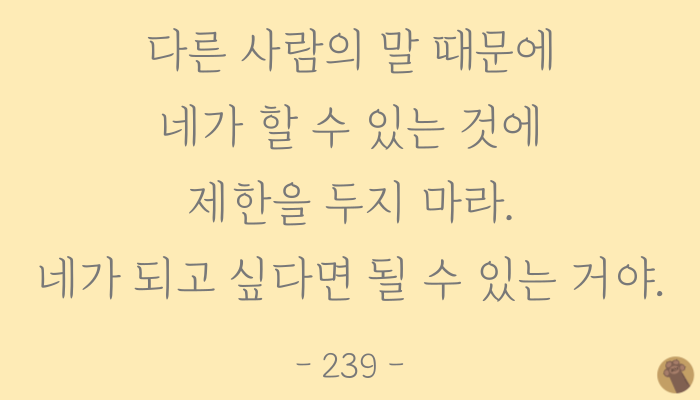 주목해야 할 것은 내게 용기와 힘을 주는 사람이 곁에 있어야 하는 게 아니라 스스로 한계를 정하지 말라는 거예요.