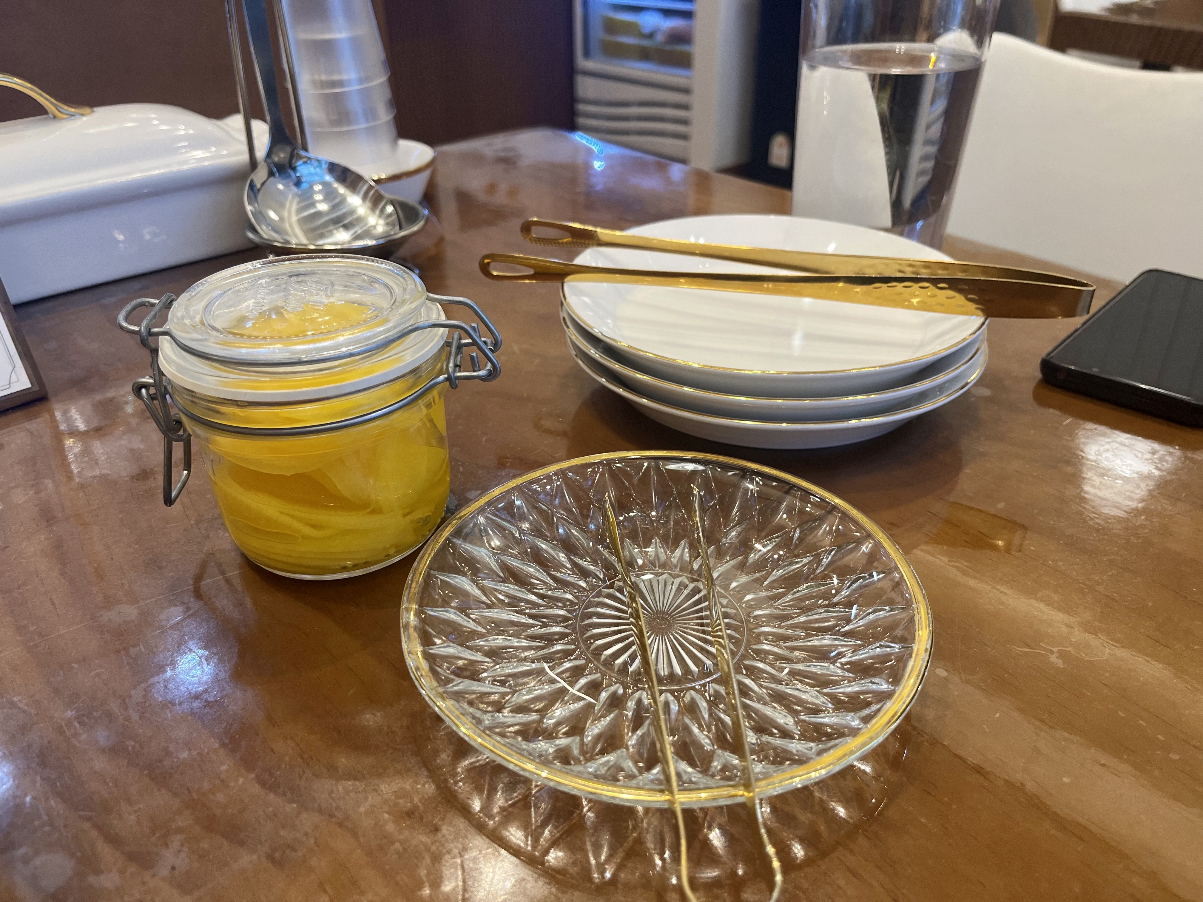 수저통과 접시도 고급스럽고 예쁘다.누를황떡볶이라 황금색 집게와 수저가 있나 보다.기본반찬으로 덜어먹을 수 있는 단무지가 통째로 있는데, 단무지가 아주 얇은 것도 좋았다.