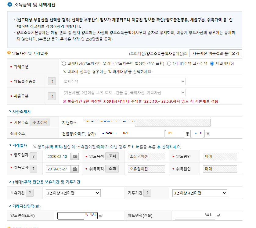 맨 위에 과세구분을 선택하고 주소와 거래일자, 취득일자, 보유기간, 면적등을 입력한다.