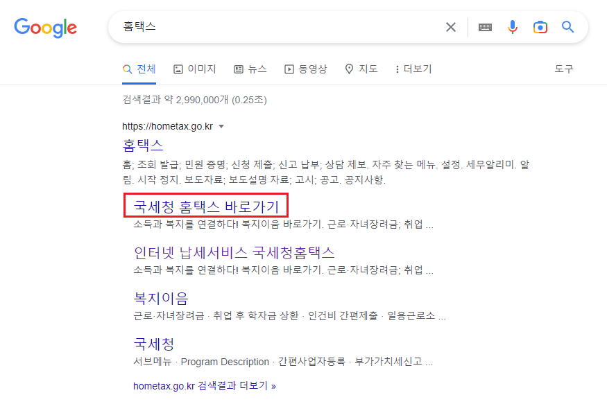 검색창에 홈택스를 검색해서 국세청홈택스 홈페이지로 들어가 보자.