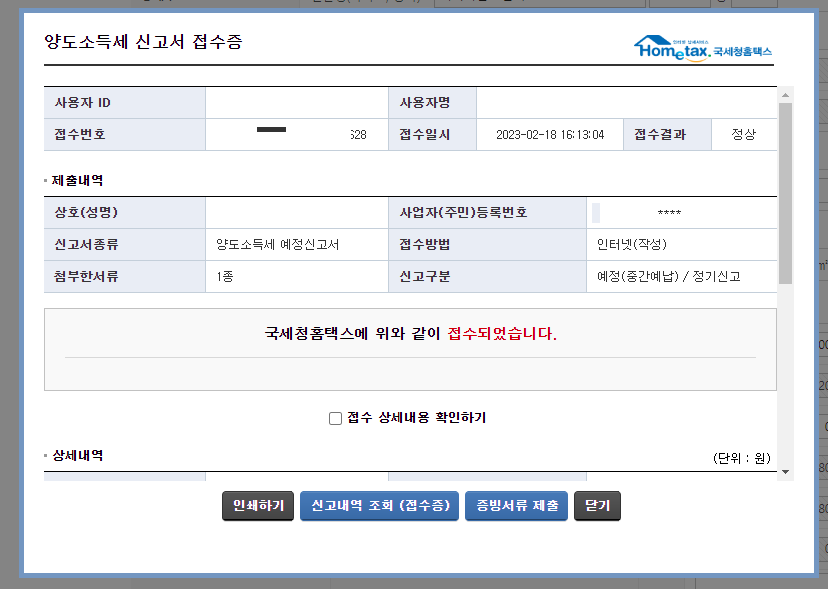 이후에 언제든 국세청홈택스에 들어가면 내가 낸 신고서를 확인할 수 있다.