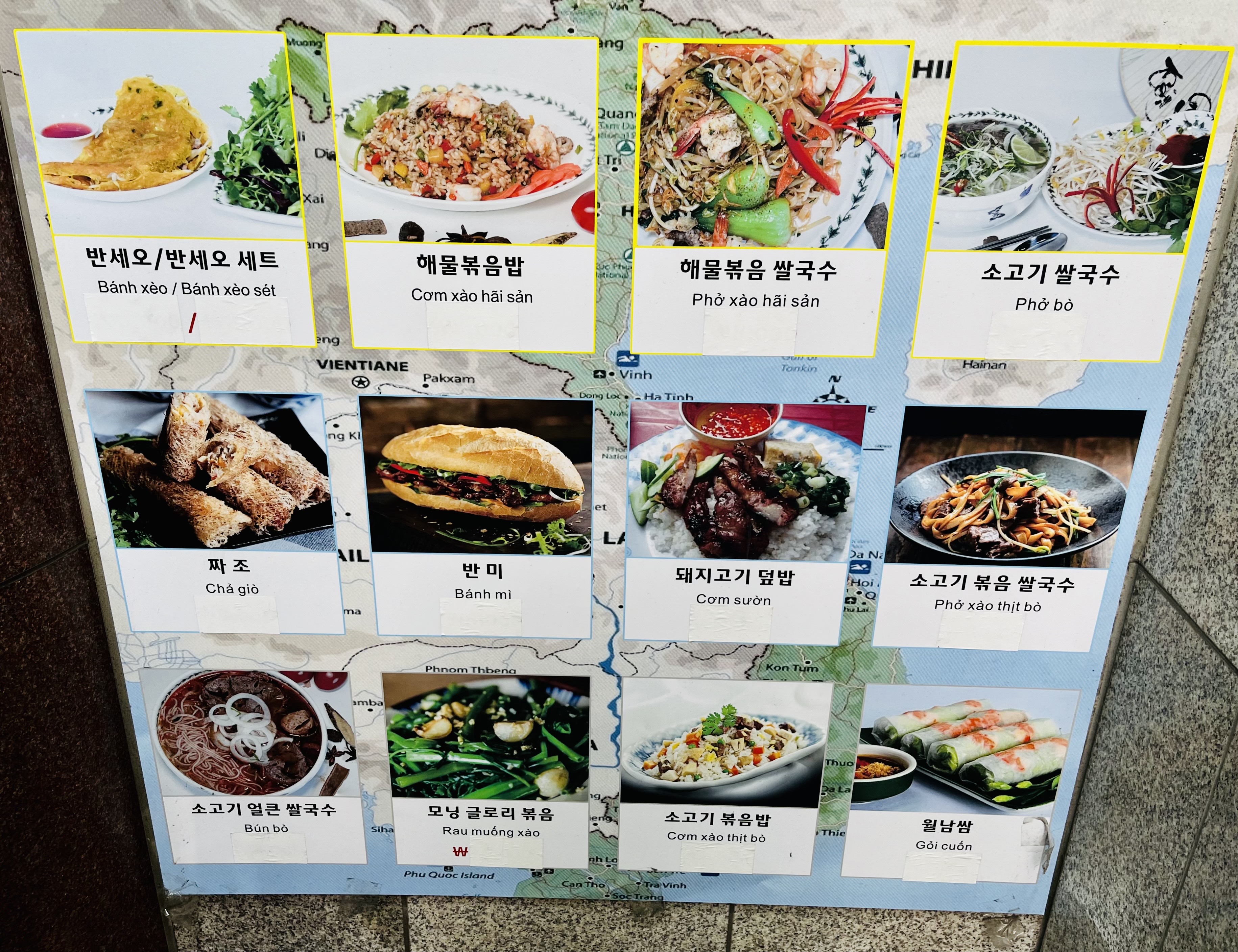 쌀국수 종류가 메인이고 덮밥이나 볶음밥, 베트남씩 샌드위치인 반미, 술안주로 할만한 음식들도 보인다.