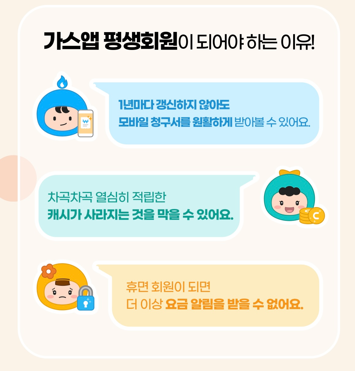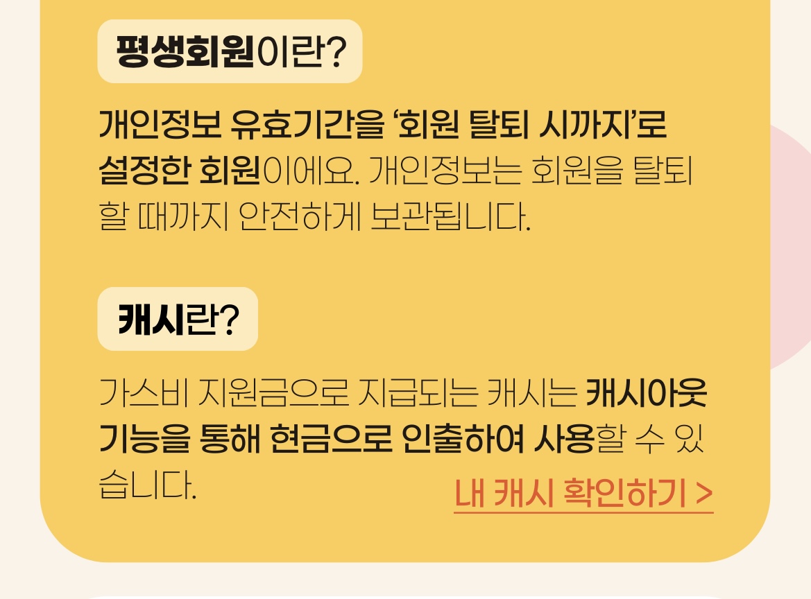 가스앱 평생회원이 되면 1년마다 개인정보를 갱신하지 않아도 되고 가스비로 쓸 수 있는 캐시를 지키기에도 좋다고 한다.