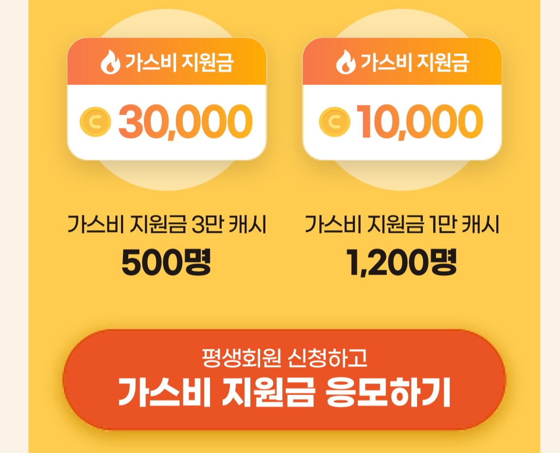 총 300명에게 5만 원, 500명에게 3만 원 1,200명에게는 1만 원을 지원해 준다.아래 평생회원 신청하고 가스비 지원금 응모하기를 눌러준다.