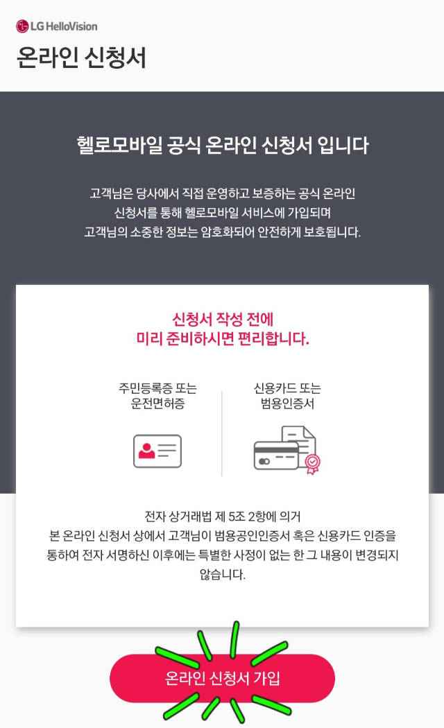 신분증과 본인 명의의 신용카드를 미리 준비해주시고 온라인 신청서 가입을 눌러주세요.