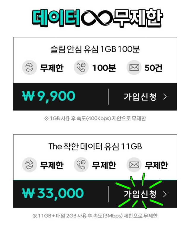 테이터 무제한임에도 33,000원(부가세 포함)인 상품을 선택했어요.