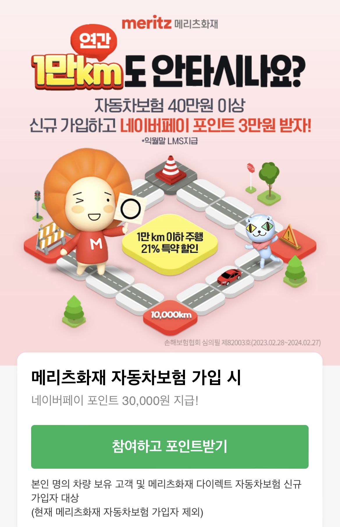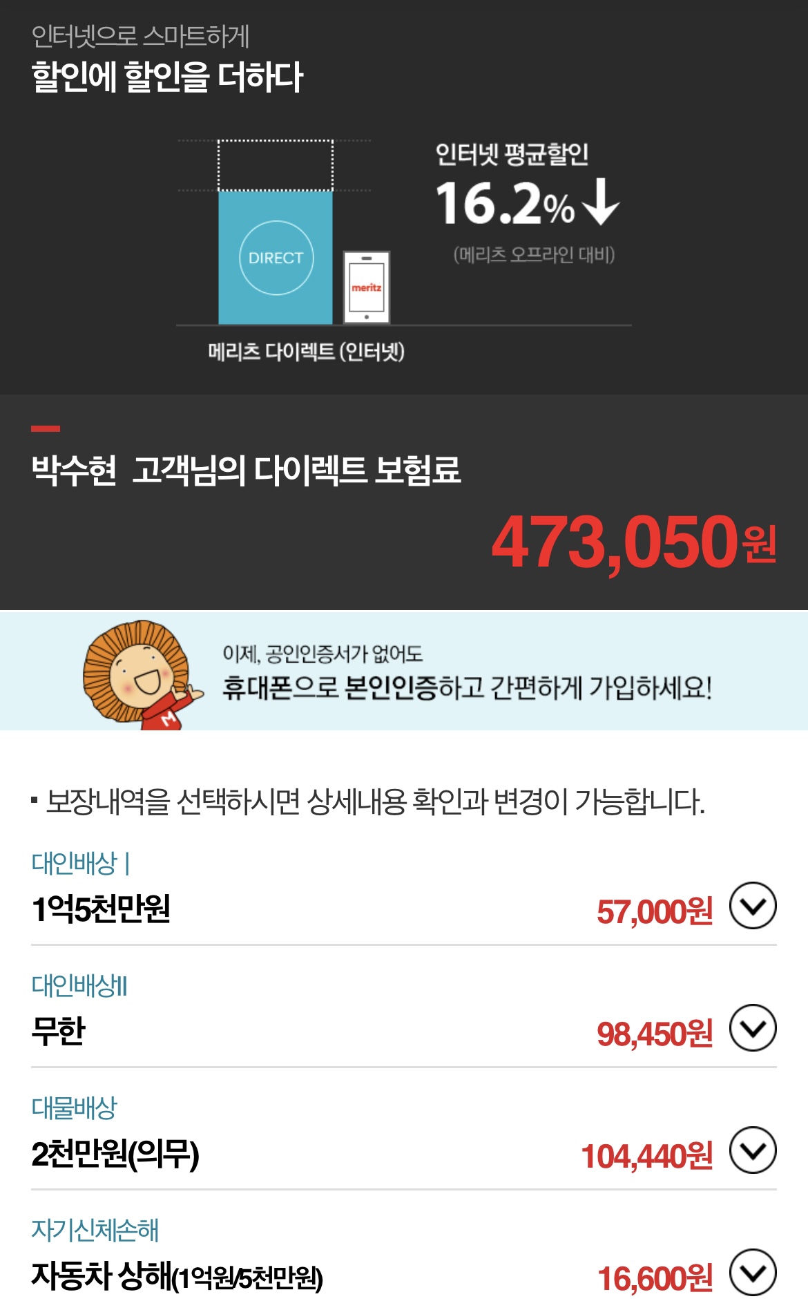 가장 저렴하면서 네이버 포인트까지 받을 수 있는 메리츠화재 다이렉트로 선택했다.