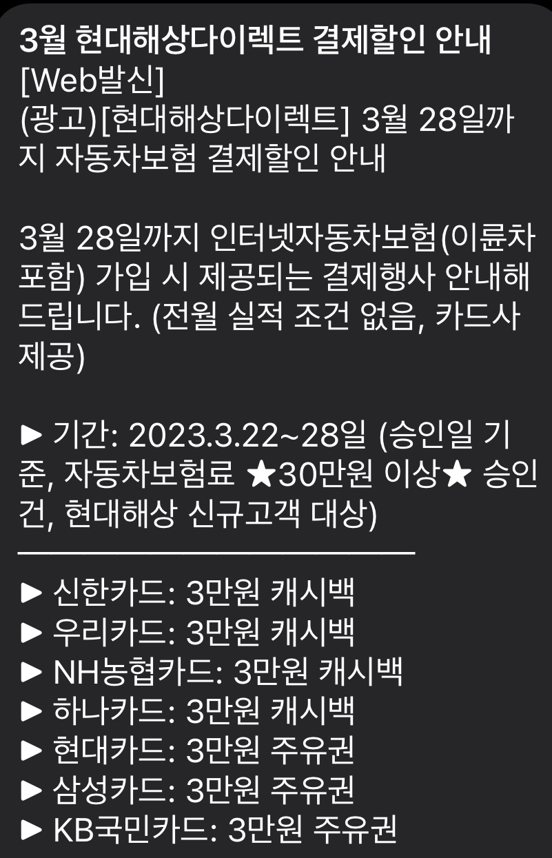 다만, 이런 이벤트를 통해 포인트를 받는다는 것은 여러 보험사에게 내 정보를 넘겨주는 것이므로 이후 마케팅 문자나 전화가 자주 올 수 있다는 것을 유념하자.