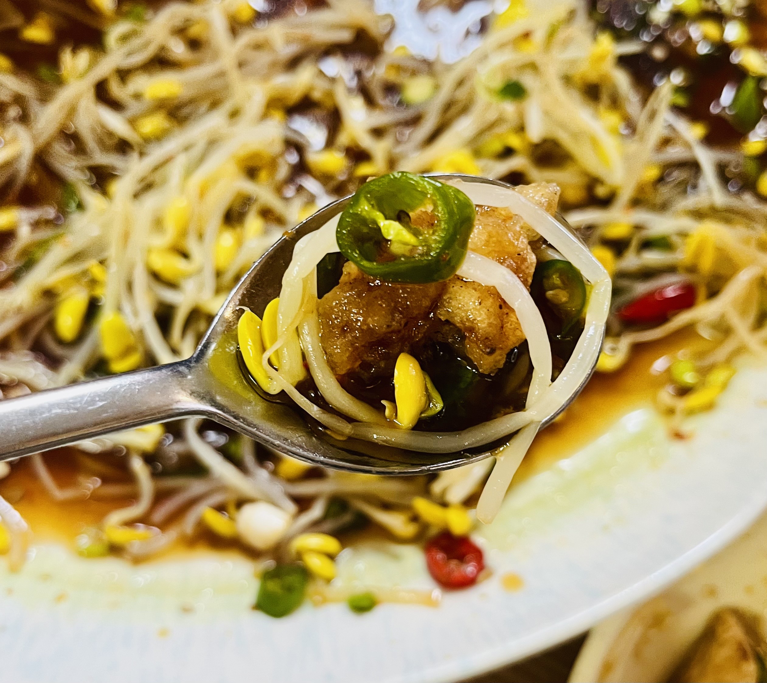 간장 탕수육 위에 콩나물이 탑처럼 가득 쌓여있다.