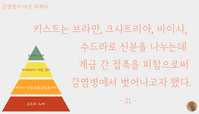 감염을 막기 위해 계급 간 이동을 금지했던 것이 카스트제도의 시작이란 것이다.