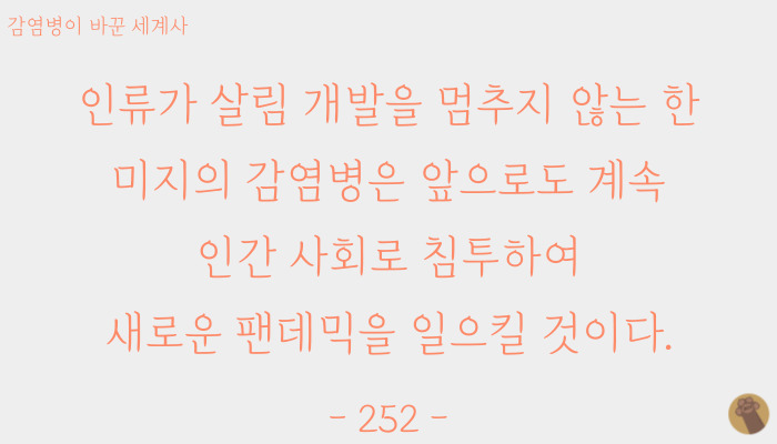 패스트, 말라리아 등 과거의 감염병은 상상할 수 없을 만큼 두려운 존재였다는 것을 새삼 깨달았으며, 감염병은 인간의 발전을 저지하기도 하고, 새로운 가능성을 열어주기도 한 양날의 검이라는 것도 알게 되었다.