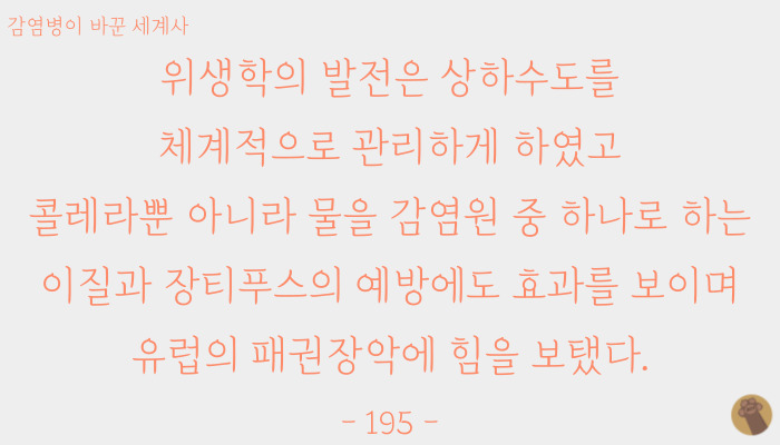 지금은 위생관리를 통한 질병예방이 너무나 당연한 상식이기에 지나치기 쉽지만 새로운 감염병은 계속해서 생겨나기 때문에 그 원인을 찾는 것과 함께 위생학은 기본적으로 강조되어야 하는 것이다.