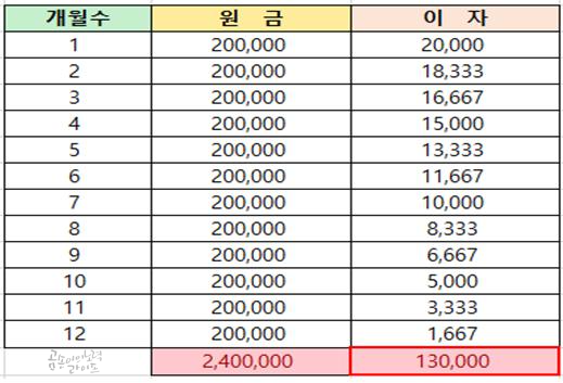 이렇게 1개월씩 줄어서 만기 전 달은 1,666,667원의 이자만 지급되는 거죠.