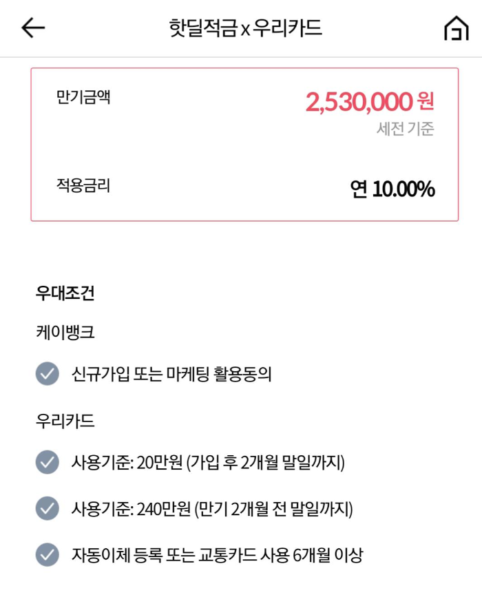 거기에 자동이체 또는 교통카드를 사용해야 10%의 금리를 모두 받을 수 있죠!