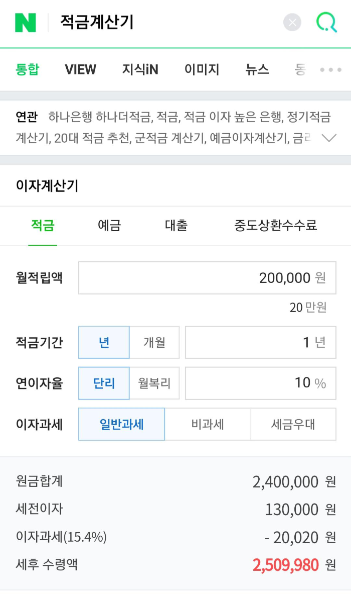 매달 20만 원 납입, 10% 금리를 받을 경우 이자가 얼마나 되는지 한번 계산해 보았습니다.