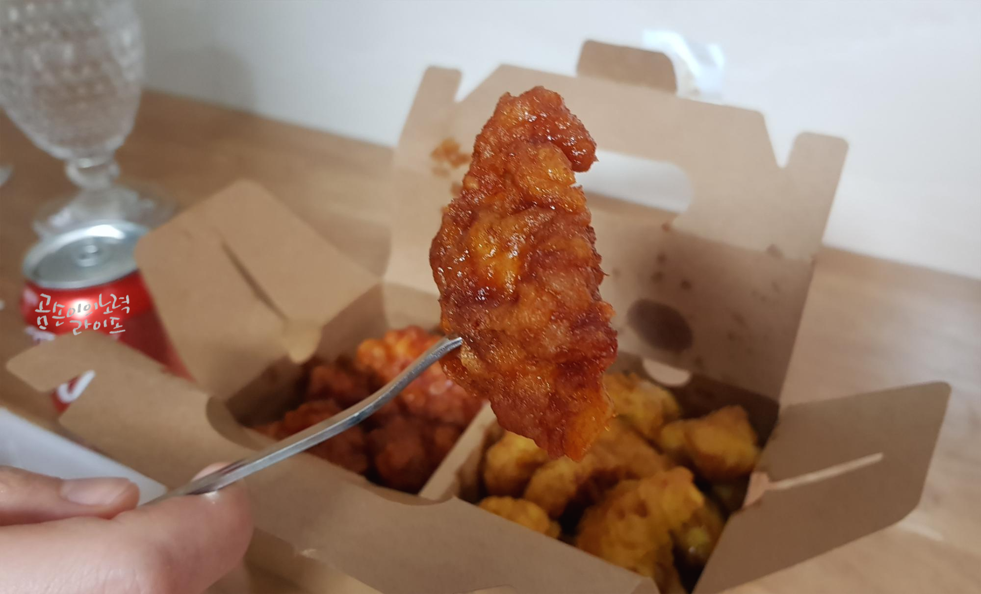 후라이드는 바삭해서 맛있었고 양념은 맵기보다는 달콤함이 더 강했어요.