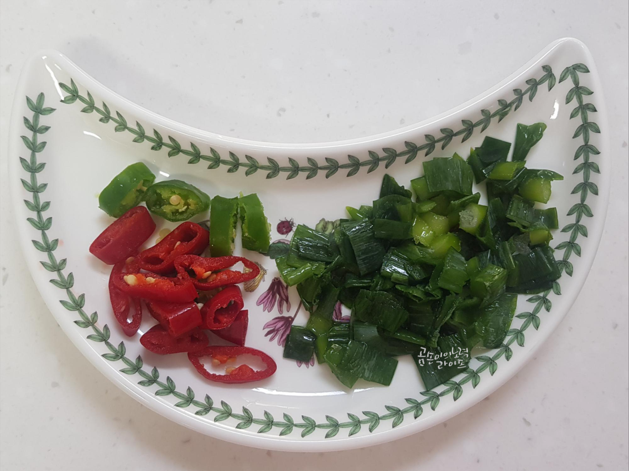 양파는 결대로 길게 썰어주고 고추와 대파도 송송 썰어서 준비해 주세요.
