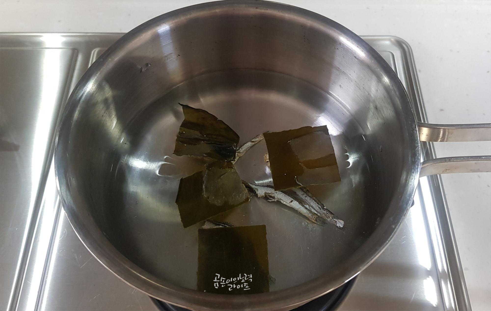 여기서 육수는 멸치 3~4마리에 다시마를 넣고 만들었어요.