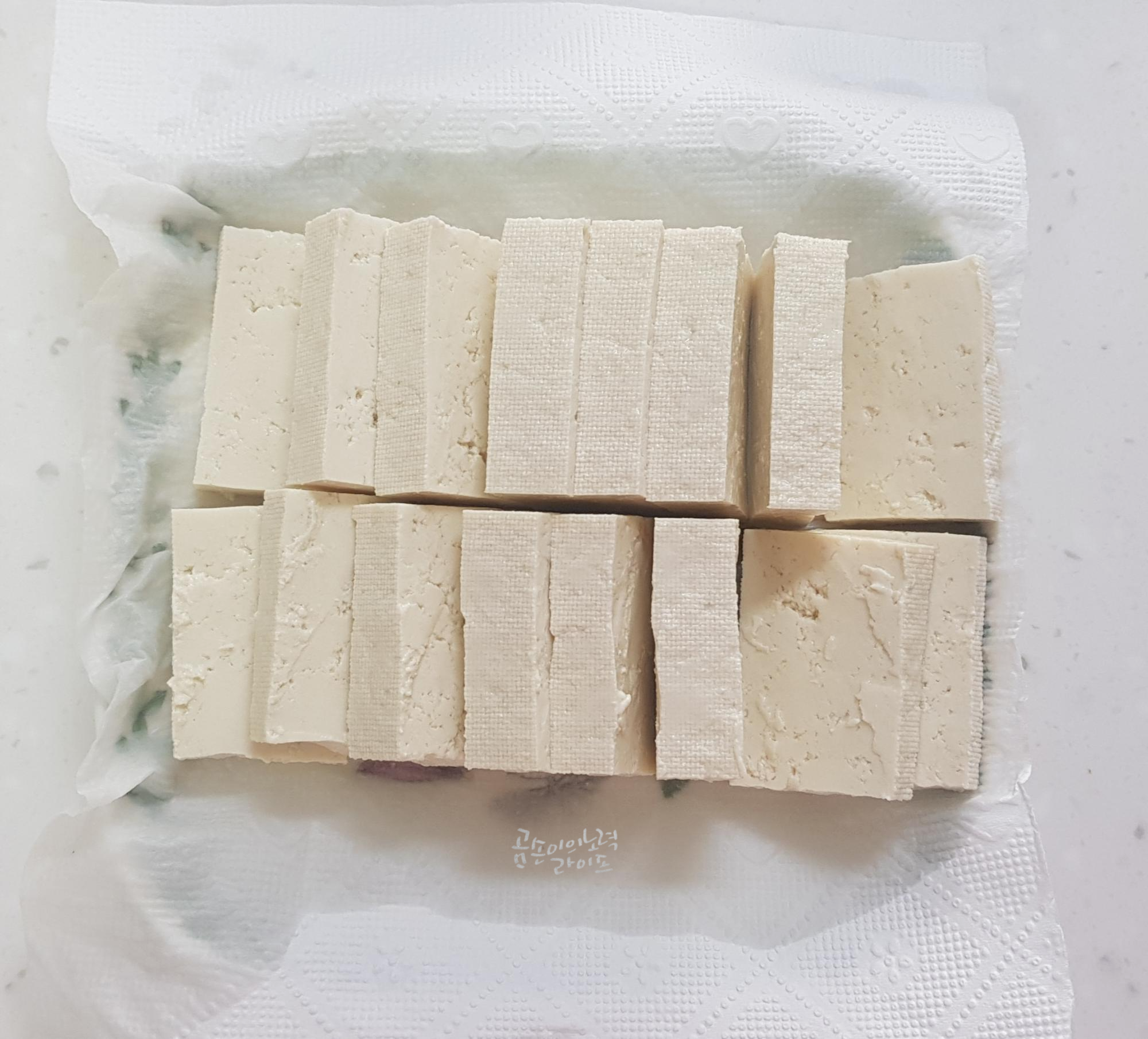 적당한 크기로 자른 두부는 물기가 빠지도록 키친타월 위에 올려놓아요.