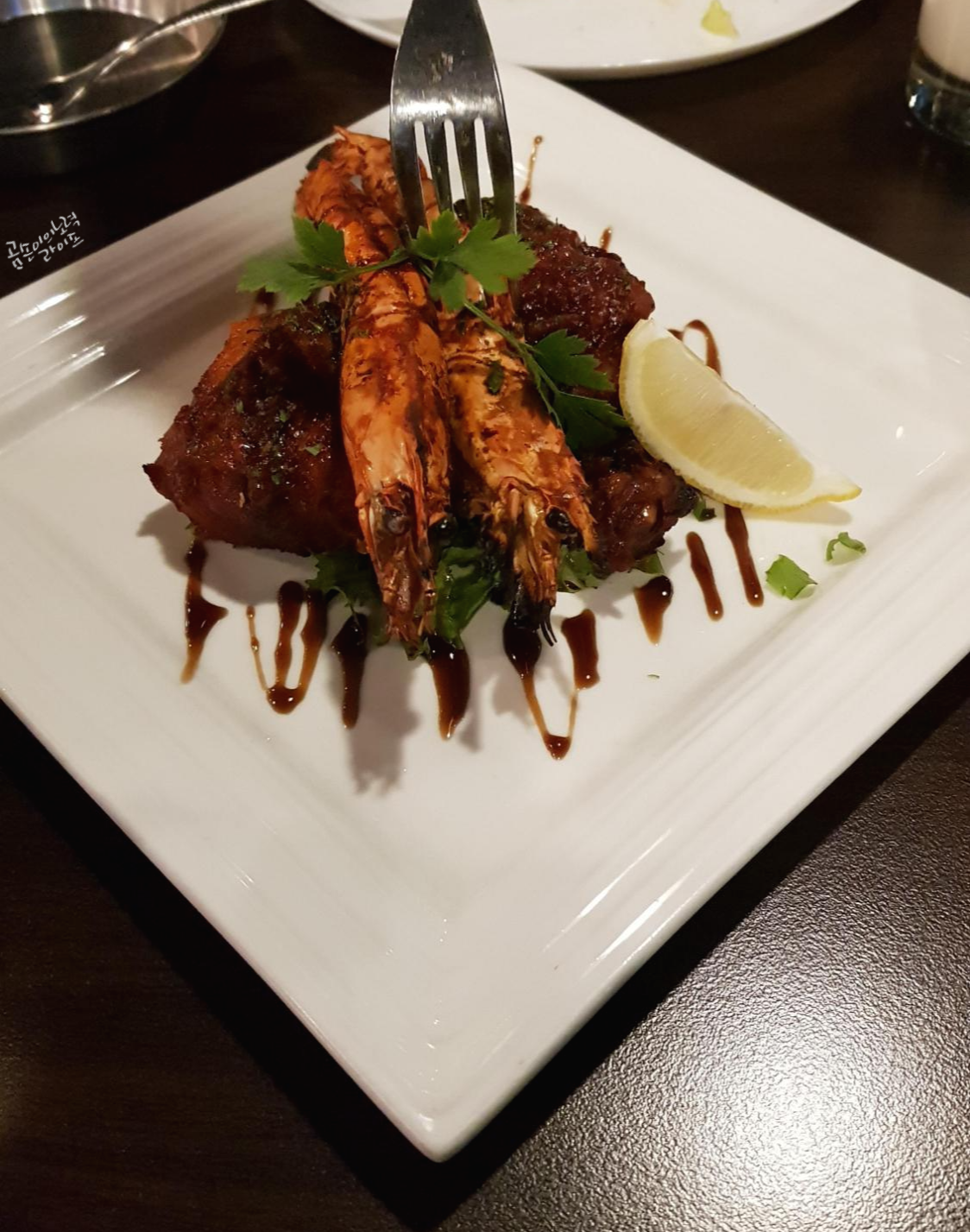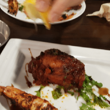 아주 큰 새우 두 마리와 탄두리 치킨 두 조각이 나왔어요.