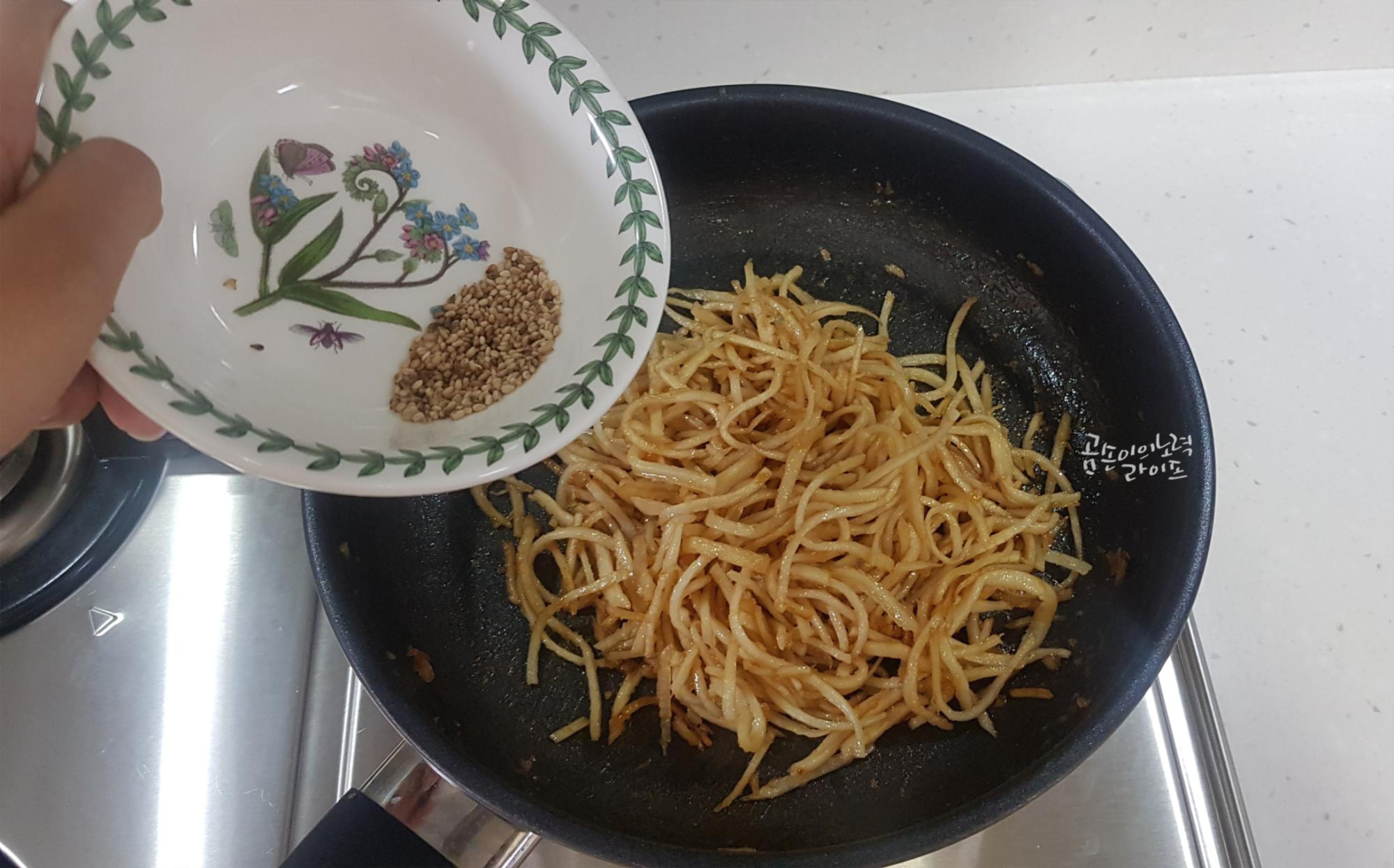 잘 볶아졌다면 불을 끄고 참기름과 통깨를 넣고