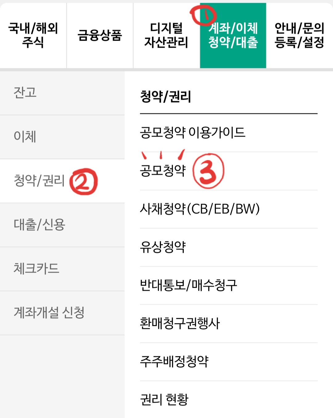 홈 화면 전체 메뉴에서 계좌/이체/청약/대출 탭을 누른 후 청약/권리로 들어가면 공모 청약 메뉴를 찾을 수 있습니다.