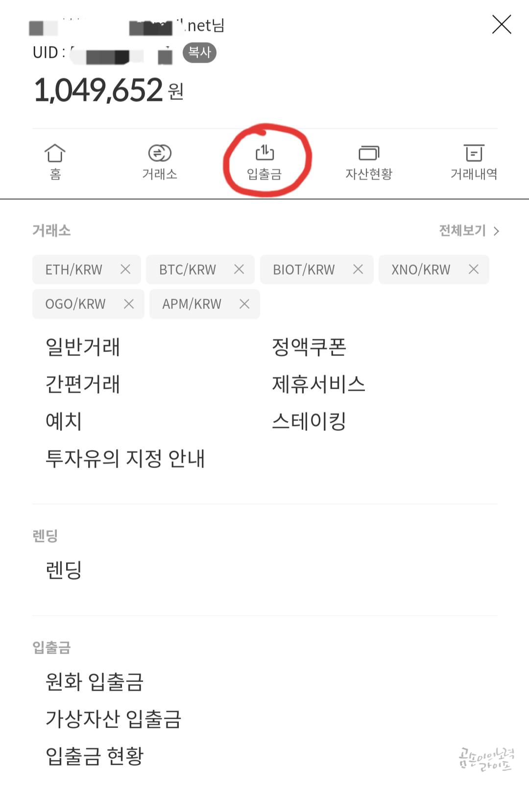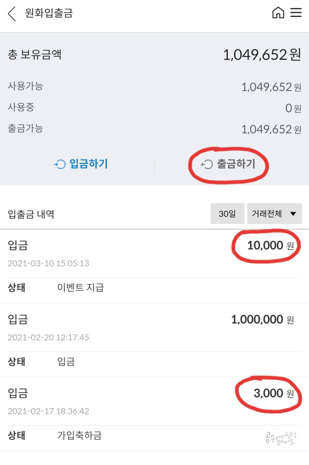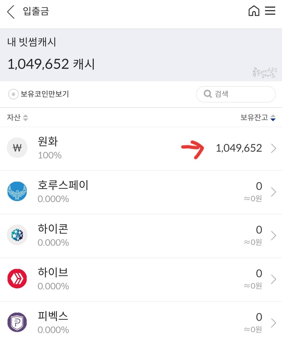 입출금 메뉴로 가서 원화의 잔액을 확인한 후 출금하기를 누르면 됩니다.