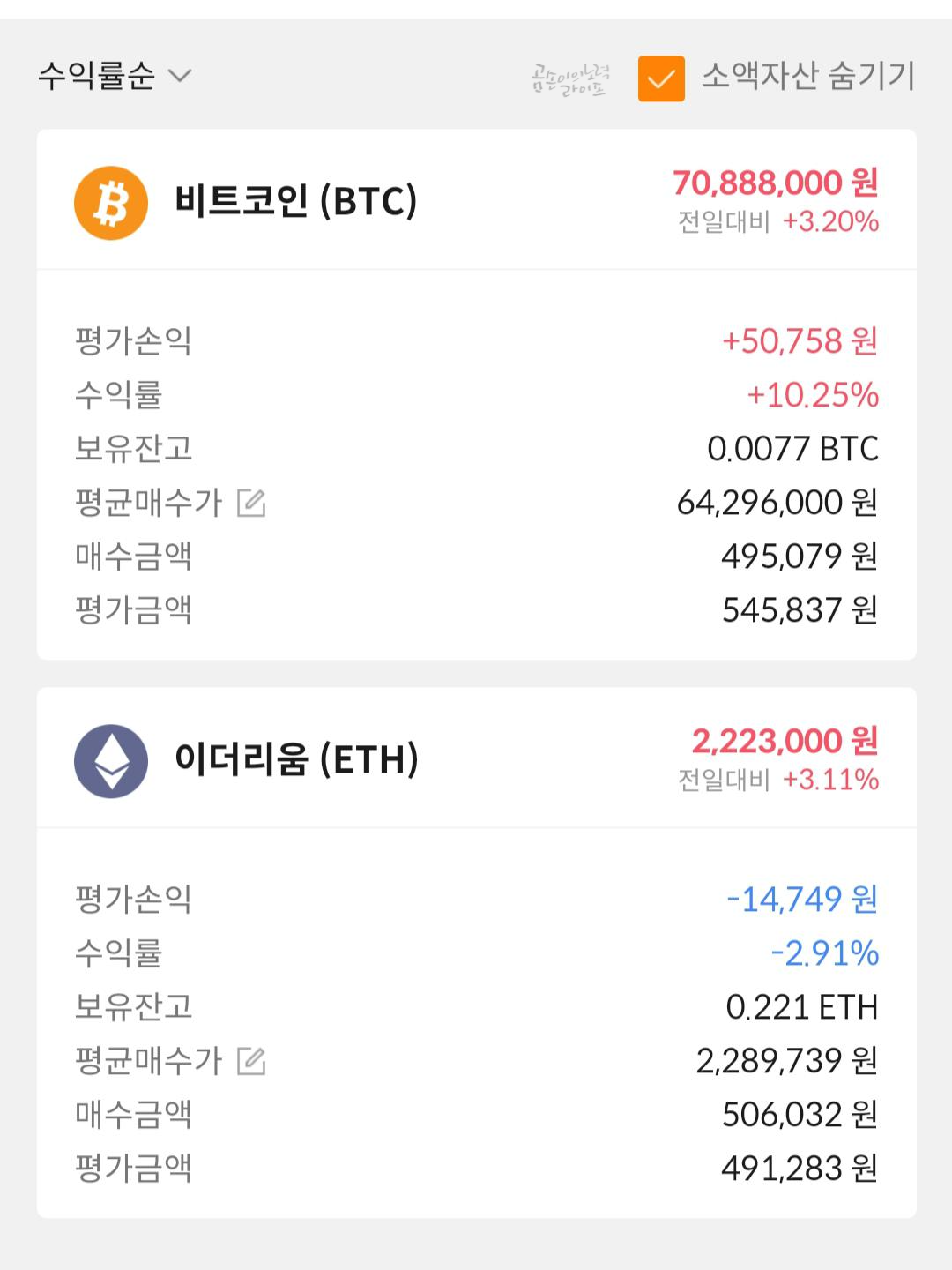바로 100만 원어치 비트코인과 이더리움을 샀더랬죠.