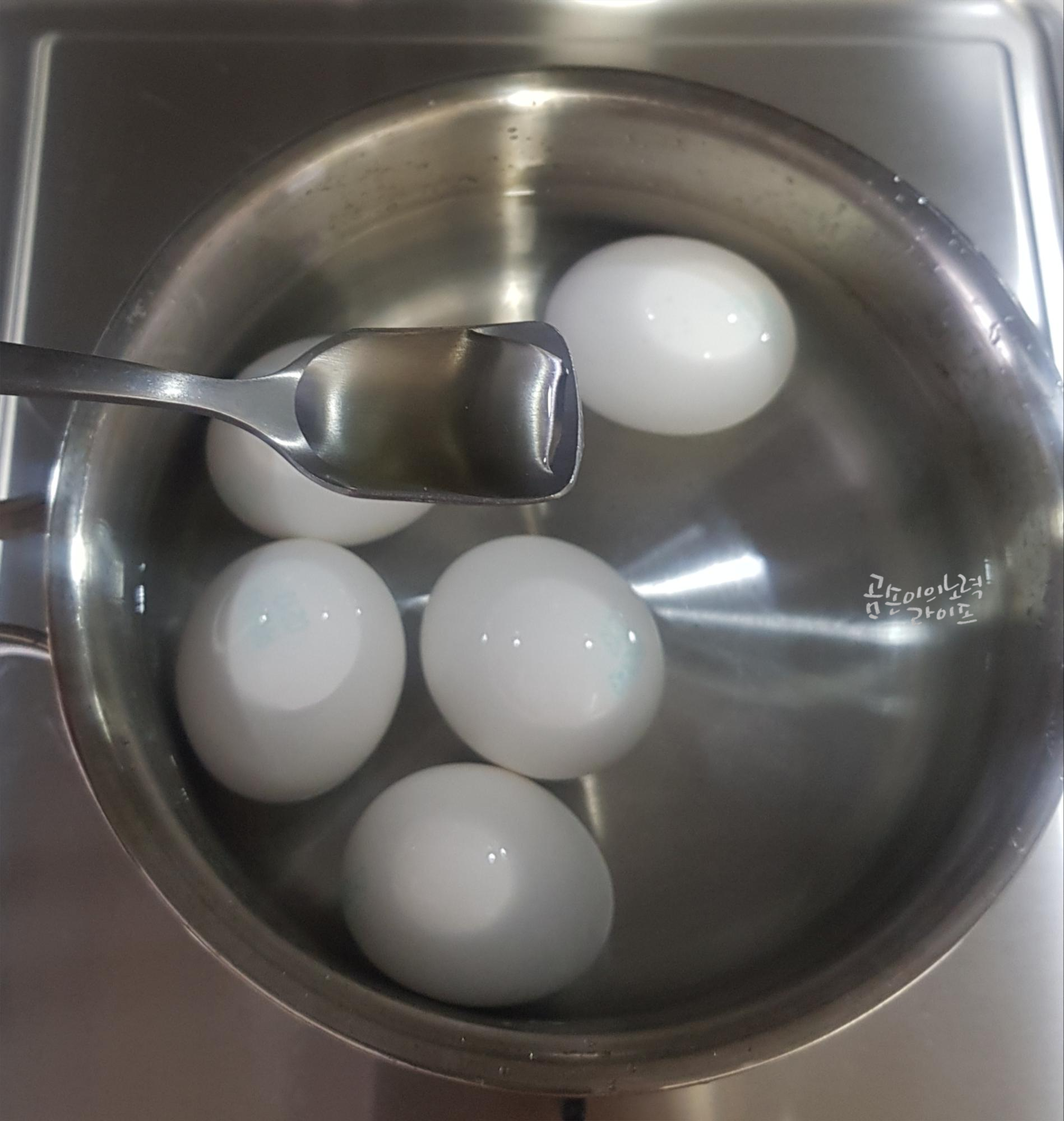 그리고 달걀을 삶을 때 식초 1 작은 숟가락과 소금 1작은 숟가락을 넣고 삶으면